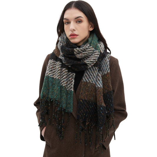 Women's Color Block Plaid Elegant Scarf - Winter Warm Stripe Thick Scarves Shawl ODM