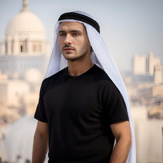 The Ghutra is a traditional Arab headscarf similar to the Shemagh, but it is usually white or has a subtle monochrome border, more simple and elegant, and is very common in many Gulf Arab countries (such as Saudi Arabia, UAE, Kuwait, etc.).