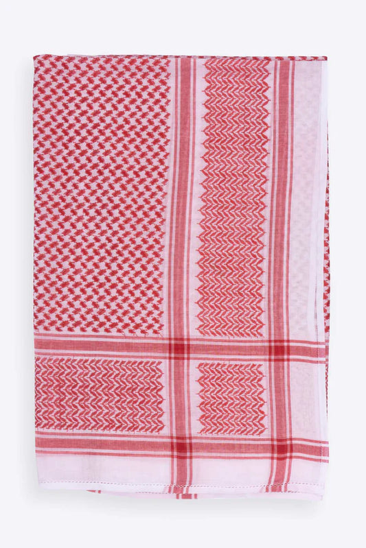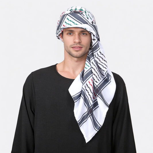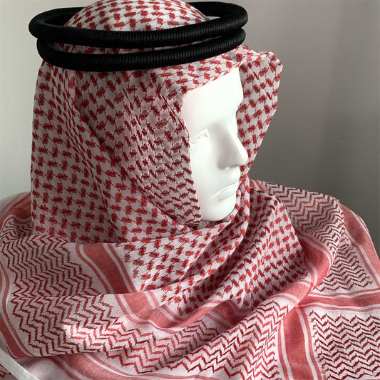 The Keffiyeh (or Shemagh, Hatta) is a traditional Middle Eastern and Arab headscarf. It is usually square, made of cotton, wool, or blended fabric, and has a distinctive woven pattern. The main features of the Arabic scarf include: