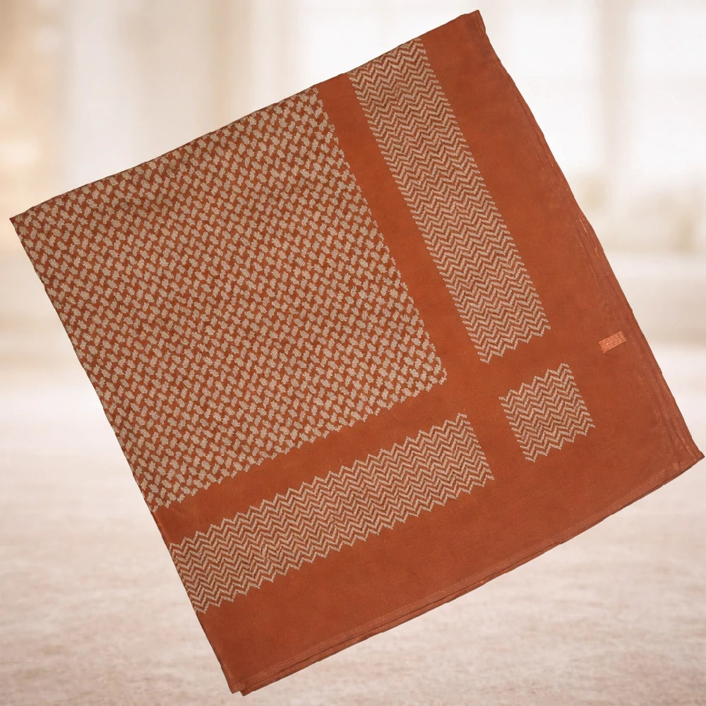 Unfolded, it becomes a 130 x 130 cm desert panorama. Its sandy-yellow base resembles dunes bathed in the glow of the setting sun, adorned with simple yet rhythmic geometric patterns that evoke the waves of a sand sea. It does not boast flamboyant brilliance but rather exudes the steadiness and harmony of an earthy palette. When wrapped, it creates a unique landscape of its own.