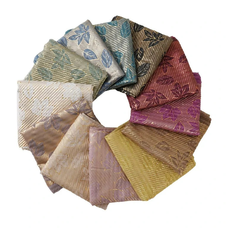 The leaf motif, enhanced by luxurious gold foil accents, draws from classic botanical designs that symbolize growth, renewal, resilience, and the cycle of seasons. Gold foil adds layers of opulence, purity, and enduring value, evoking sophistication, prestige, and timeless beauty in fashion accessories.
