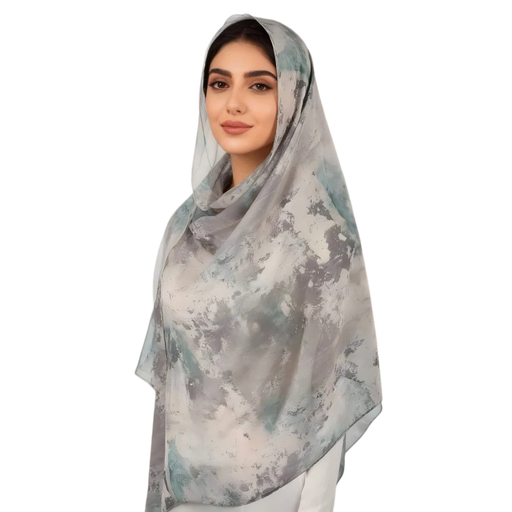 Featuring modern abstract watercolor and marble print patterns in neutral earth tones, this chiffon hijab delivers an artistic, sophisticated look. It can be styled in multiple ways: draped loosely, wrapped elegantly, or pinned for secure everyday modest wea