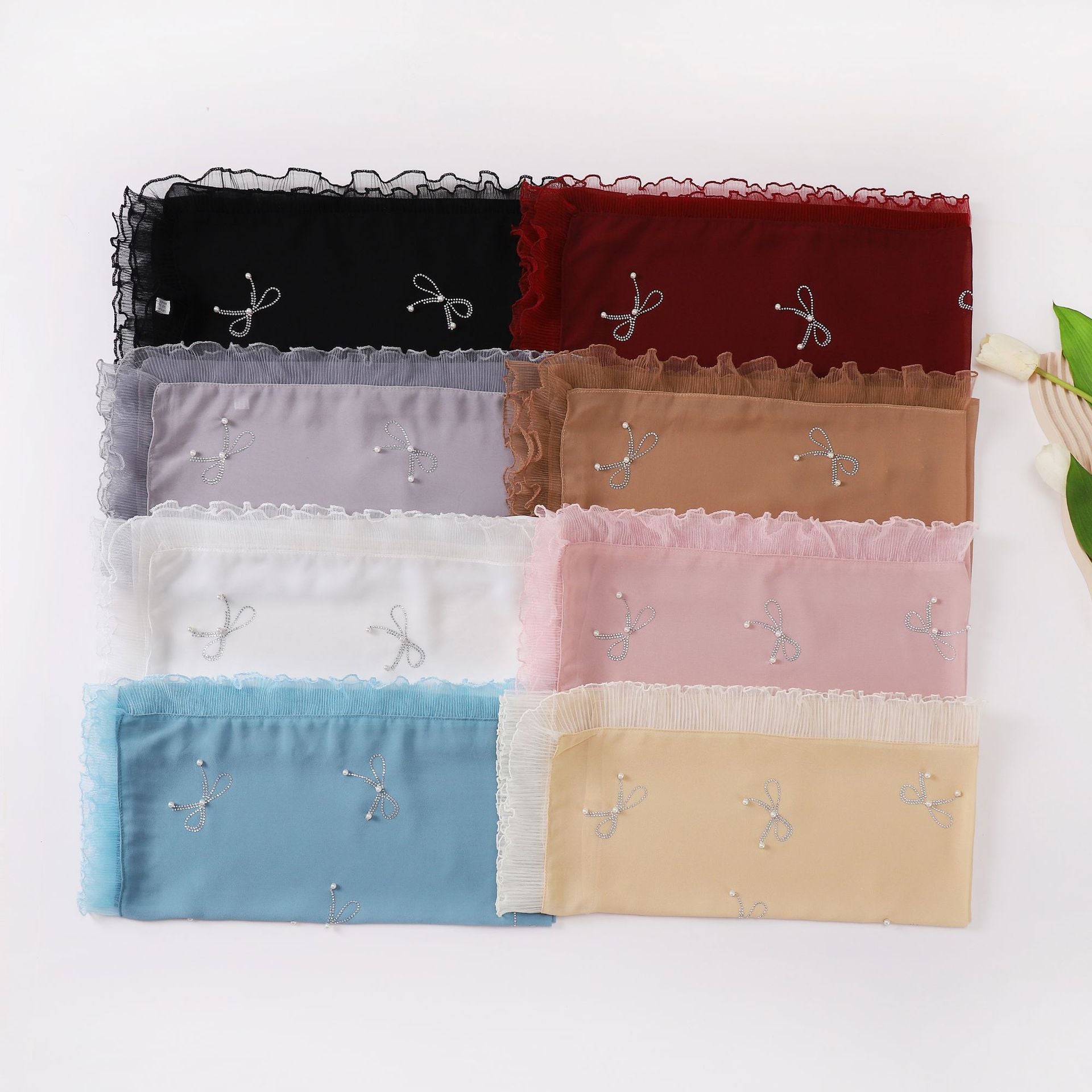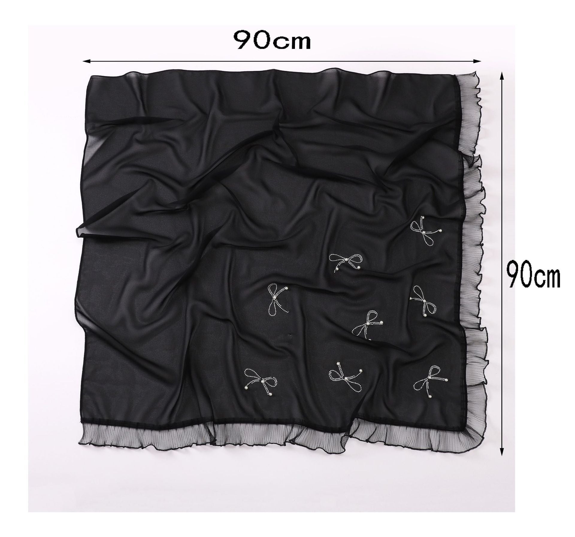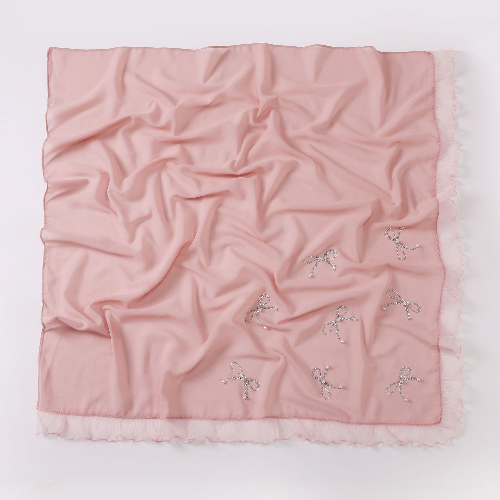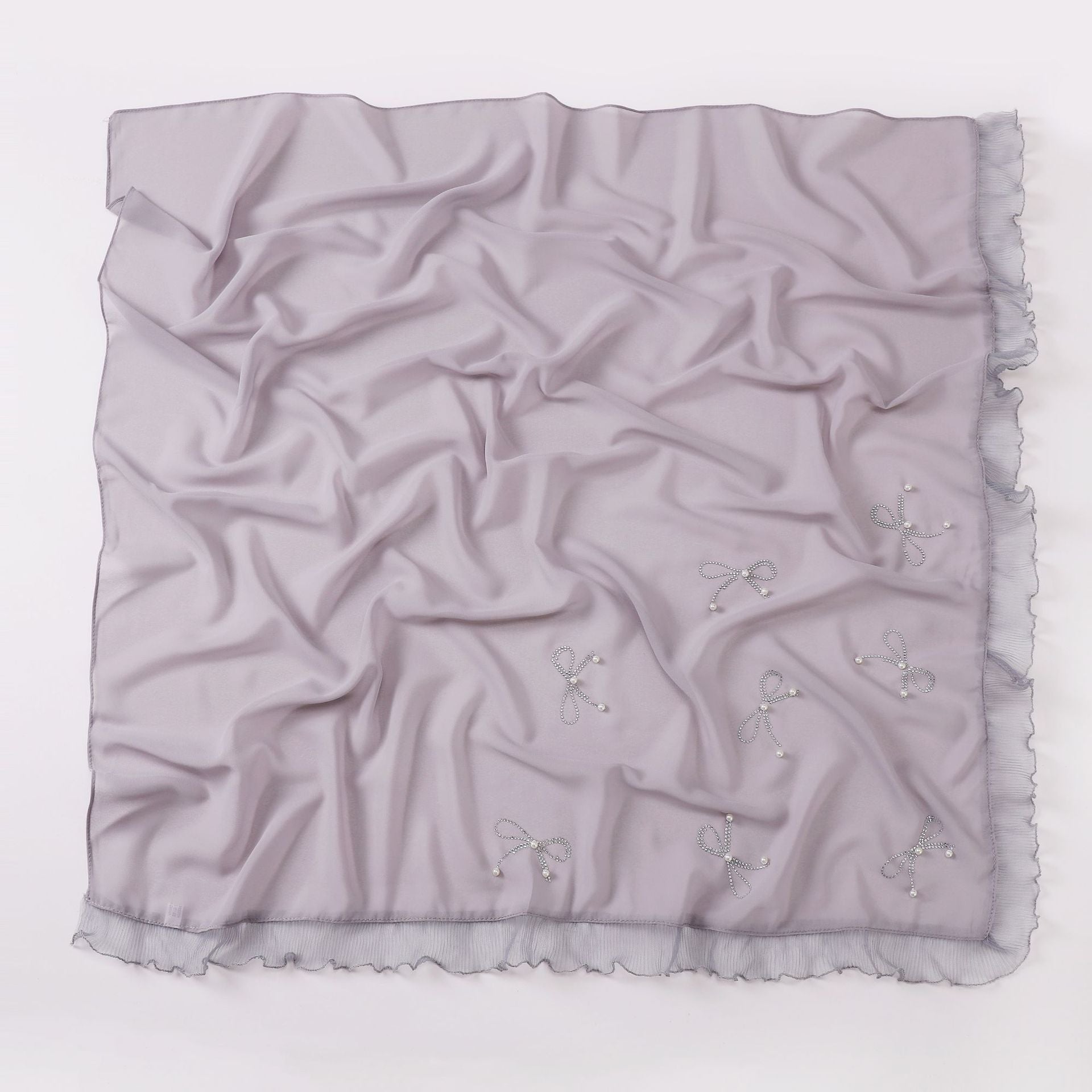 Featuring scattered pearl and rhinestone bow embellishments with delicate ruffled edges, this hijab combines sophistication and charm. It can be styled in multiple ways: draped loosely over the head and shoulders, pinned neatly under the chin for classic coverage, or wrapped and layered for contemporary modest looks.