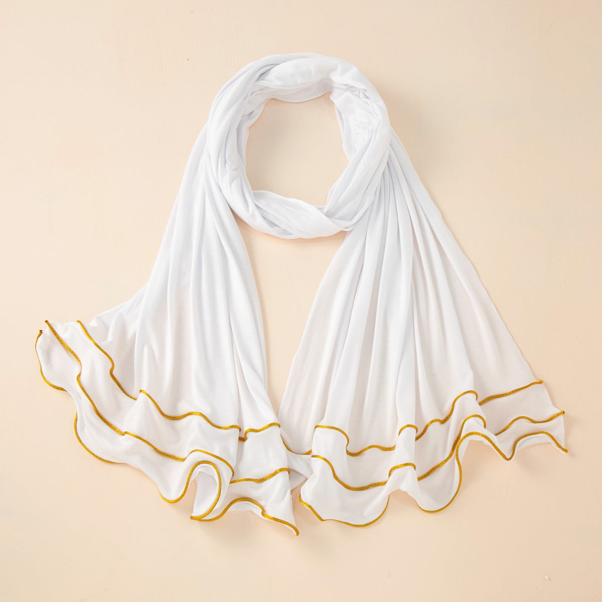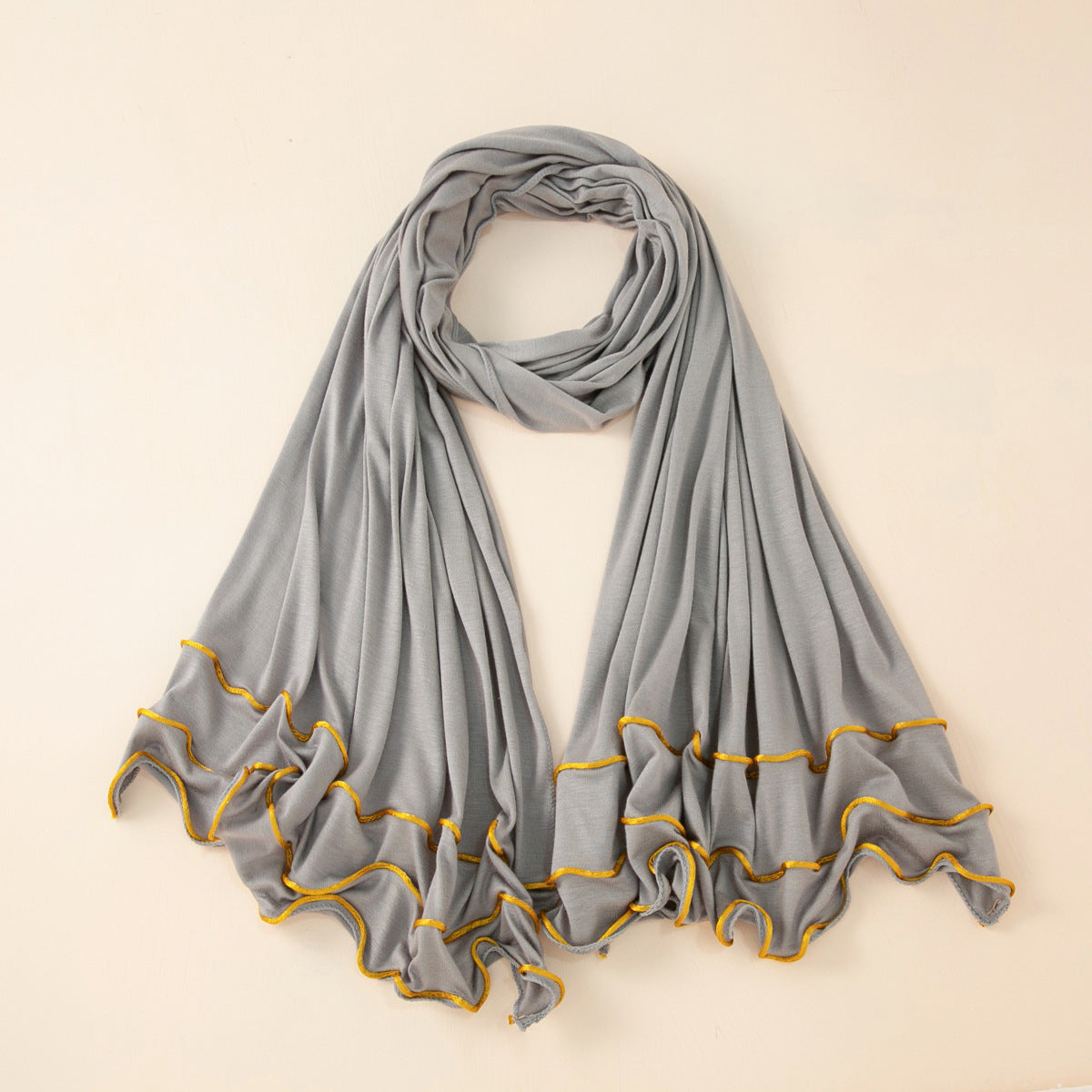 This elegant jersey hijab features a smooth, flowing silhouette with distinctive ruffled layers and gold piping along the edges, creating a refined, luxurious finish. Available in a range of sophisticated colors, the gold trim enhances visual appeal, adding a touch of glamour to the understated fabric. Its stretchy nature allows for effortless draping and secure hold, often without pins.