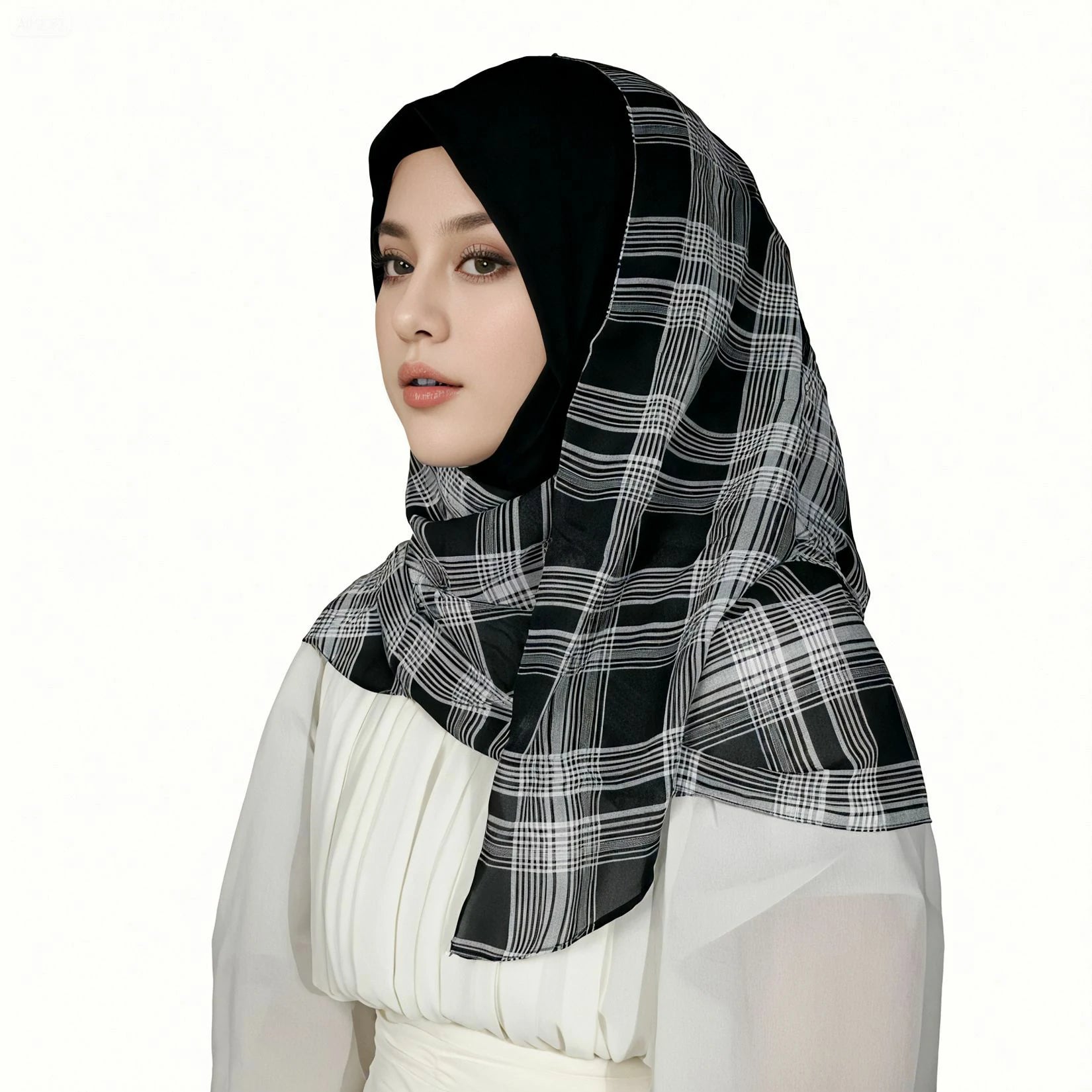 This piece features a classic plaid and tartan pattern, offering a sophisticated visual texture that transcends seasonal trends. A defining feature of this design is the integrated Soft Awning (Visor). Unlike unstructured scarves, this constructed brim provides a neat, framed arch around the face, ensuring the hijab maintains a perfect shape without collapsing. The silhouette is designed for full coverage, cascading elegantly over the chest and shoulders to provide a modest profile. The checkered print adds a touch of casual refinement, making it versatile enough for both professional settings and daily leisure.